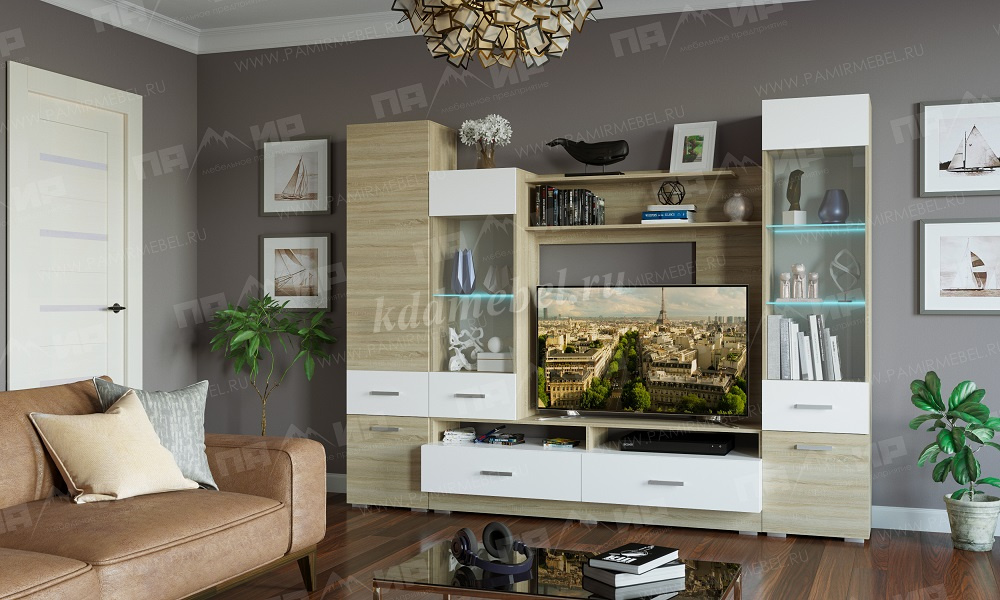 В гостиной «Элиза» применяются современные декоры: корпус ЛДСП "Дуб сонома светлый», фасад ЛДСП «Дуб сонома светлый» и «Белый глянец».