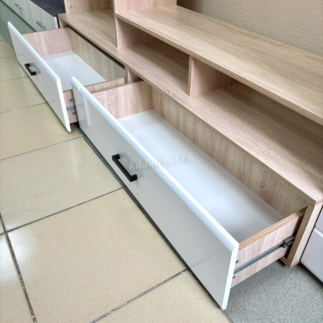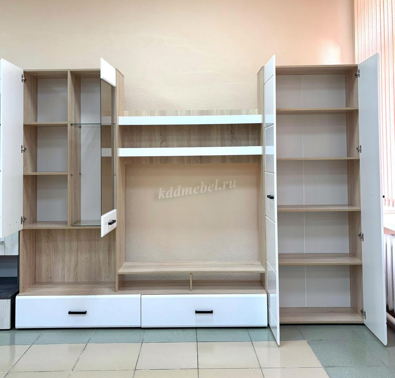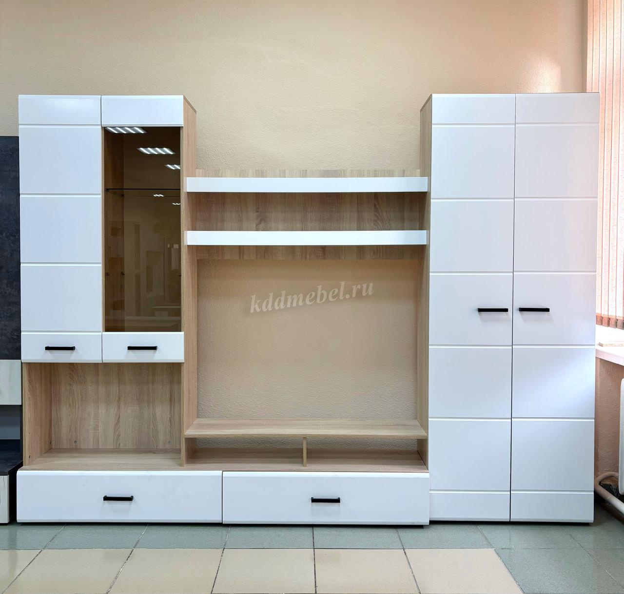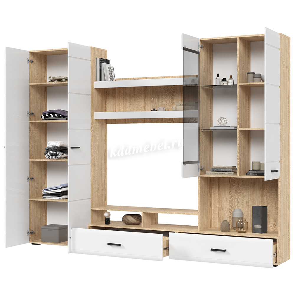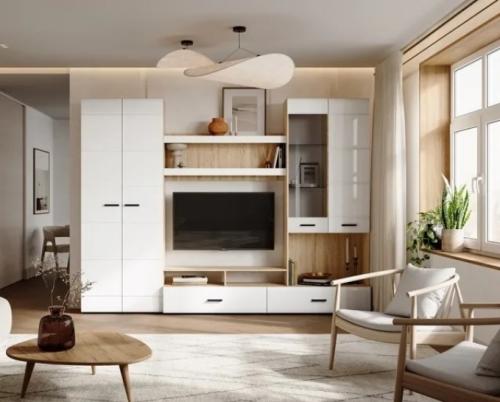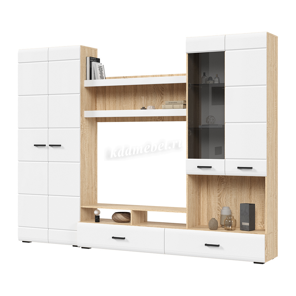 Готовое решение для гостиной «Либерти» помогает создать современный и функциональный интерьер без лишних усилий. Комплект включает вместительный шкаф с полками, секцию для телевизора, витрину с полками и выдвижные ящики для хранения. Глянцевые фасады с элегантной фрезеровкой подчеркивают строгую геометрию линий и наполняют интерьер светом. Витрина с прозрачными стеклянными полками идеально подходит для размещения декоративных элементов и книг. Сдержанное сочетание теплого древесного декора корпуса и белого глянца фасадов придает гостиной легкость, а чёрные ручки акцентируют современный характер коллекции.