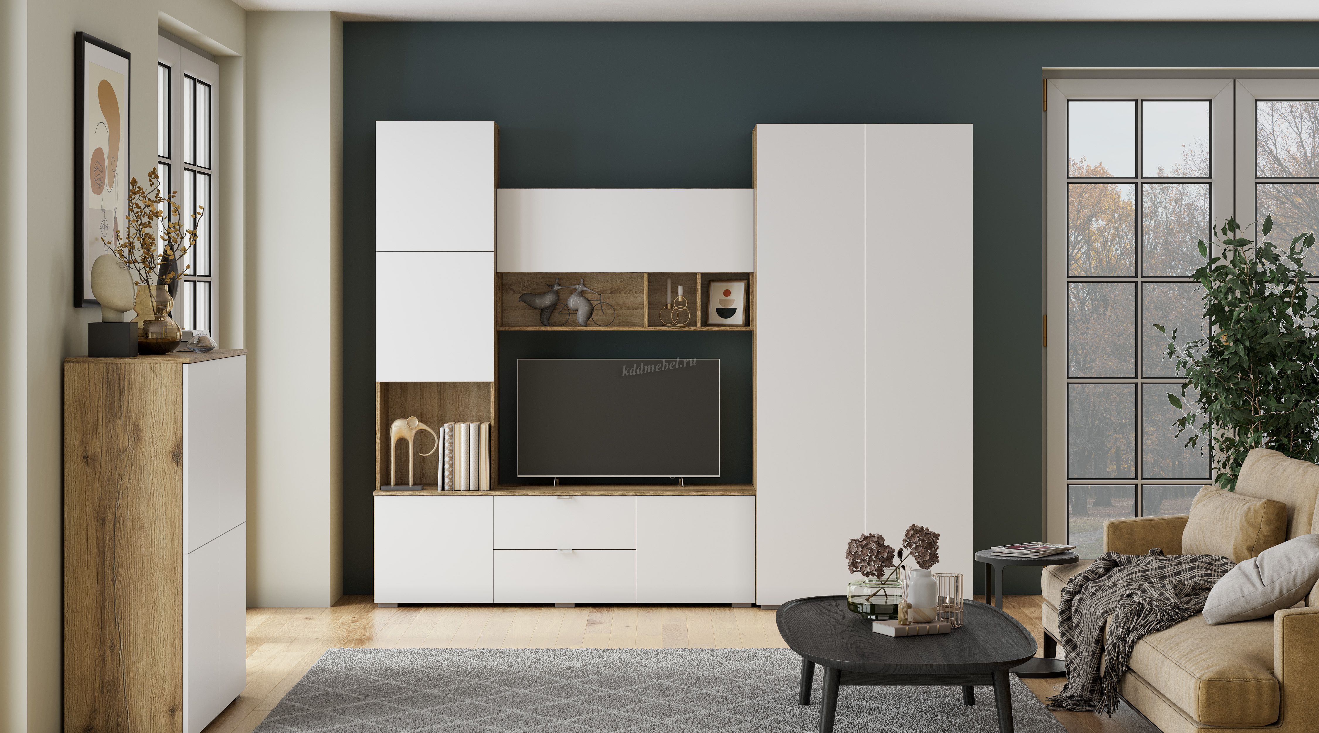 Секция визуально состоит из 3-х частей, образующих нишу для ТВ: