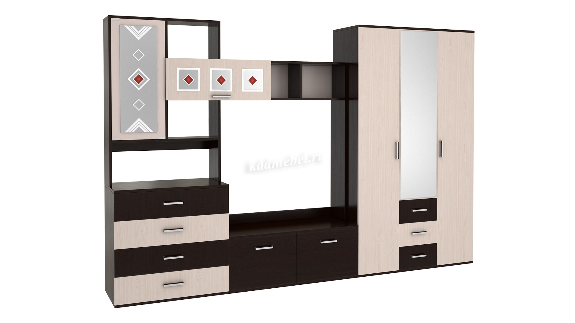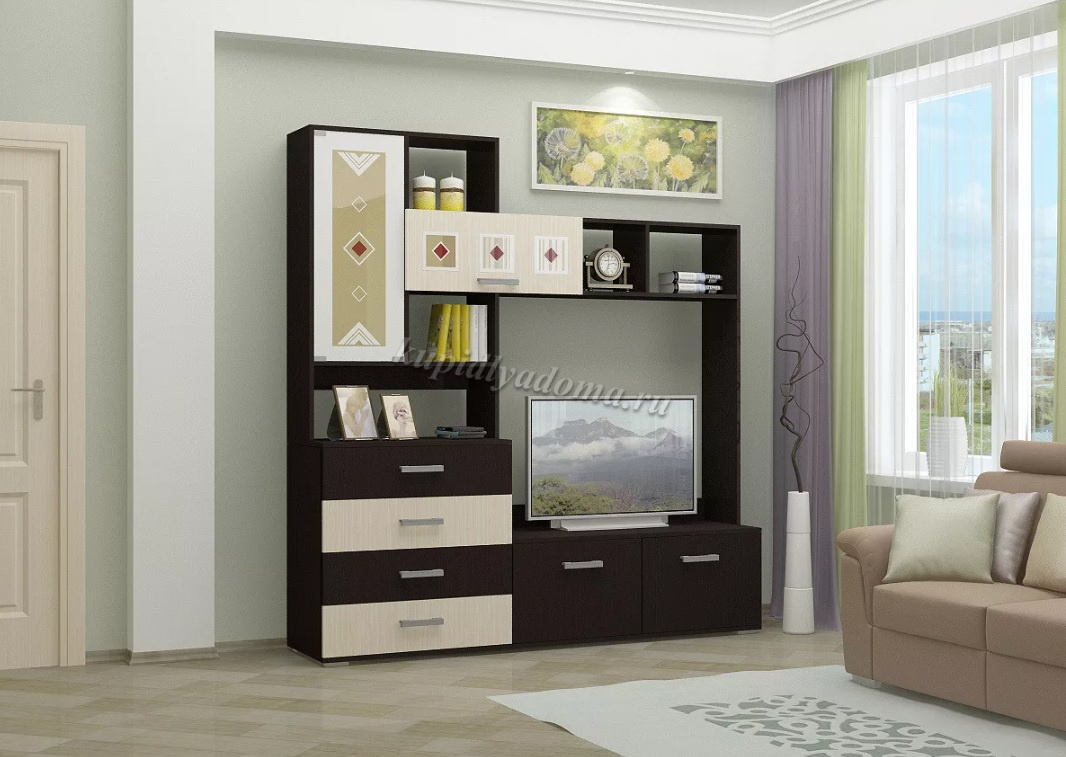 Центральная секция состоит из комода с четырьмя выдвижными ящиками, тумбы под ТВ с диагональю до 40 дюймов, а также множества закрытых и открытых полок для различных мелочей.