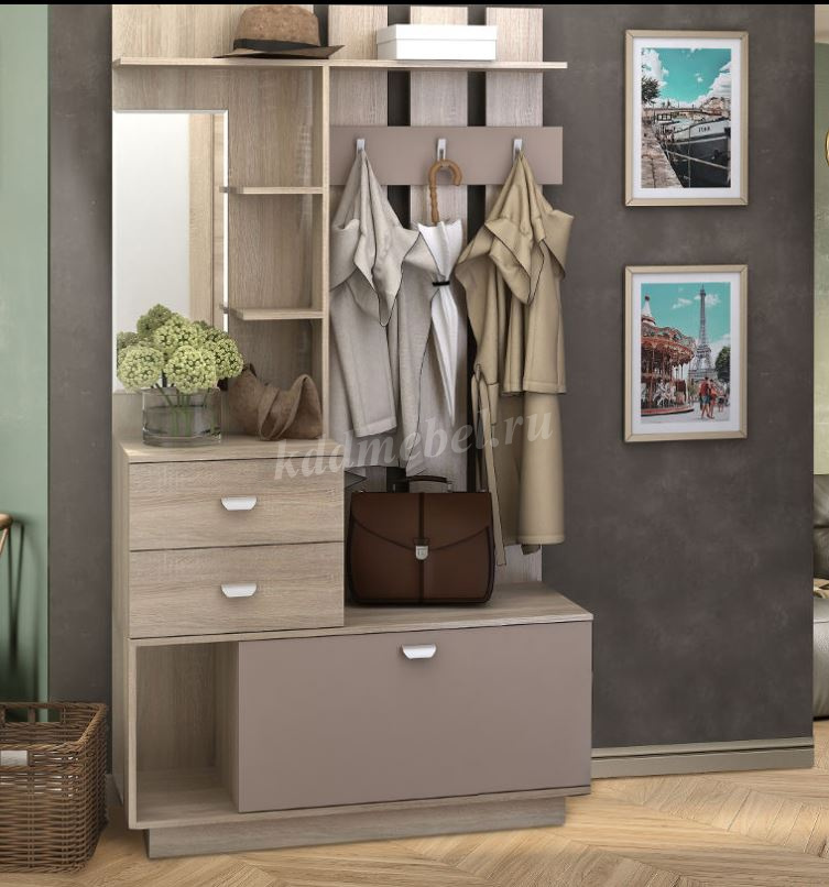 Эффективное решение для небольшой прихожей — это «Вега ». Несмотря на компактные размеры, мебель включает в себя всё необходимое для аккуратного хранения одежды и повседневных мелочей. Прихожая оснащена вместительным отсеком для обуви, ящиками, а также полками для аккуратного хранения повседневных мелочей и головных уборов.