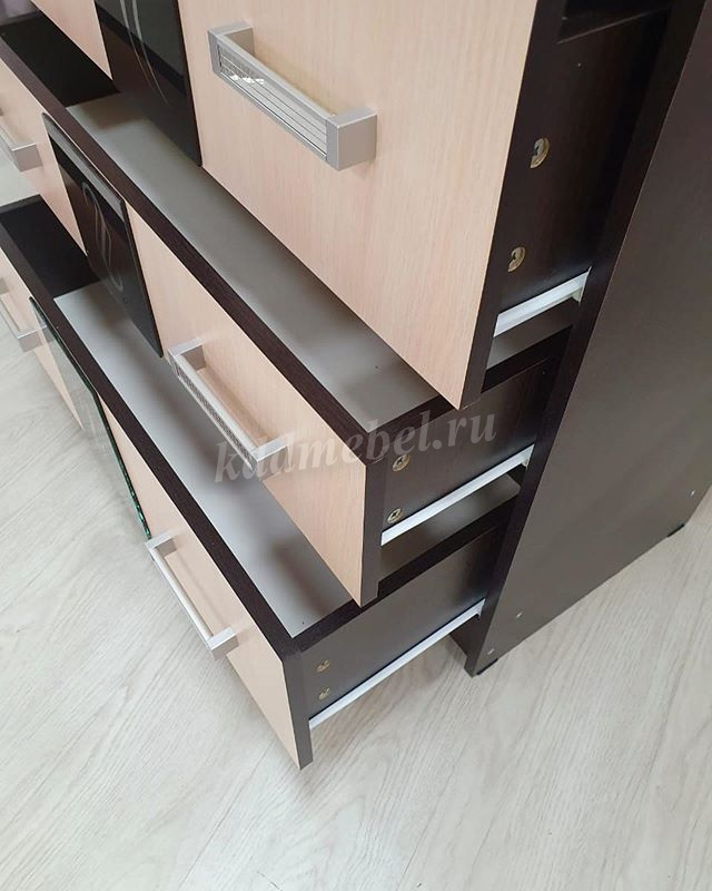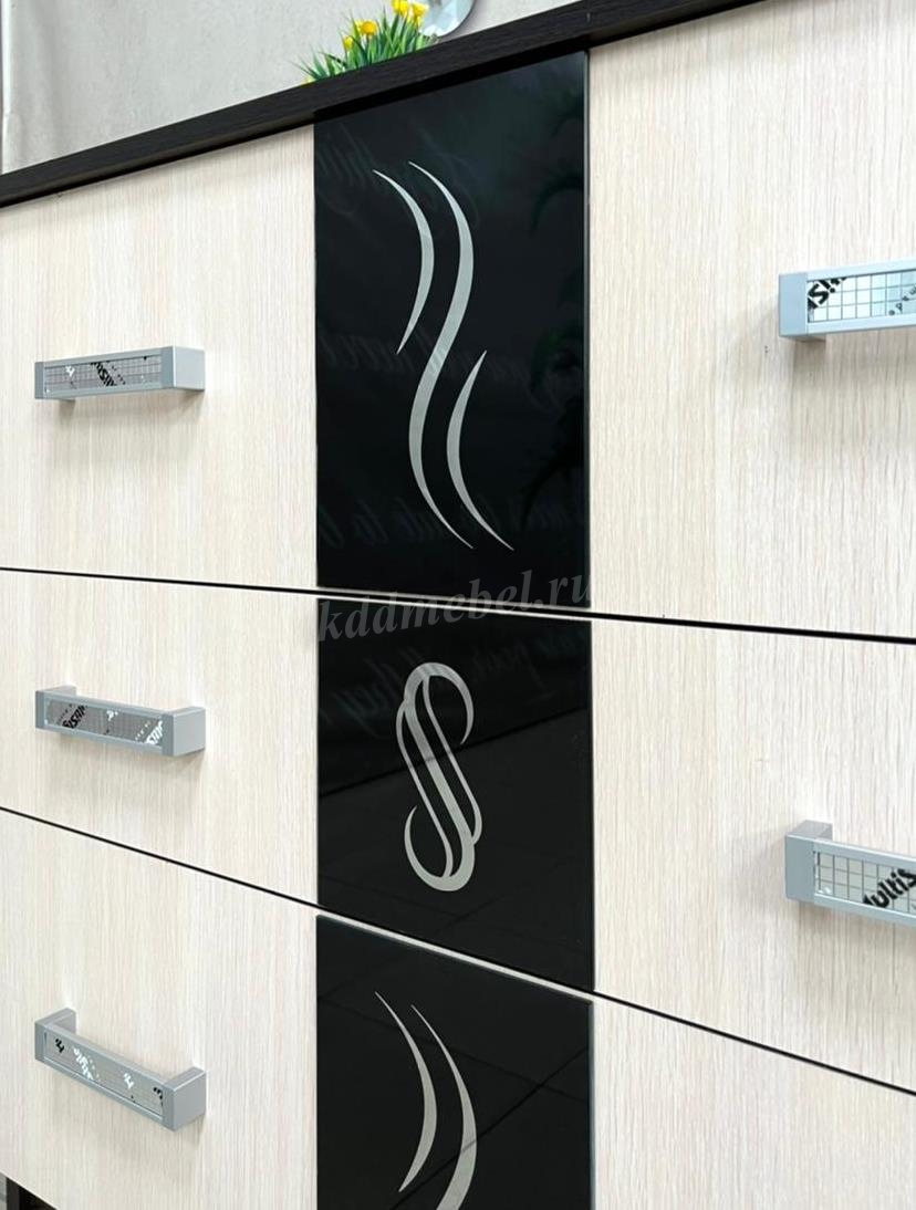 Фасады всех элементов декорированы накладками из стекла с зеркальным рисунком, наненсенным методом "Шелкография".