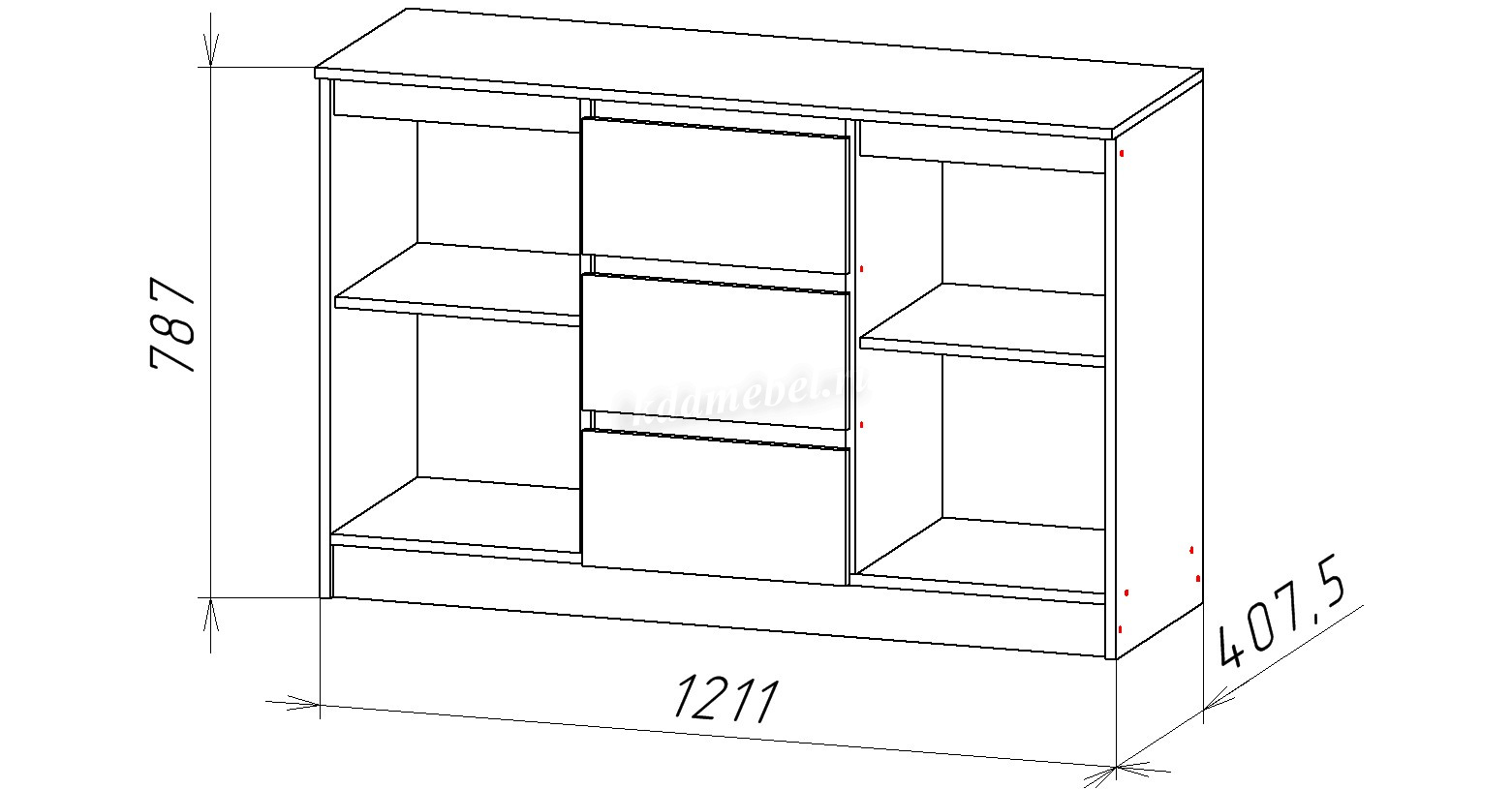 Комод с тремя ящиками и двумя дверками. За дверками по одной полке. Направляющие НПВ шариковые. Дверки и ящики без ручек. Выемка для открывания