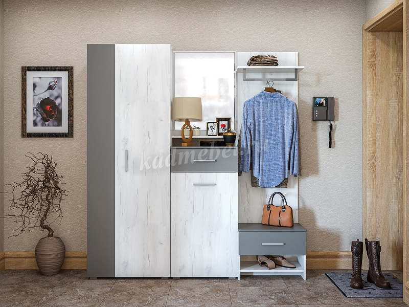 Стильная прихожая для малогабаритных квартир. Европейский дизайн подчеркивает выбор декоров холодной гаммы.