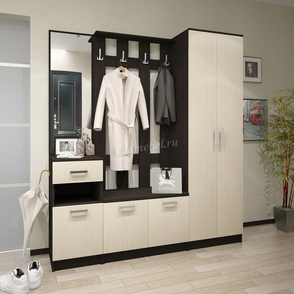 Стильная модульная прихожая Машенька позволит рационально использовать всю полезную площадь даже небольшого помещения. Светлые фасады выгодно контрастируют на темном фоне.