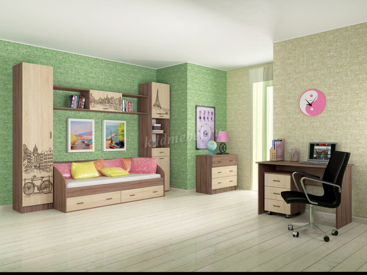 Композиция для детской спальни Орион - идеальное решение как для просторной комнаты, так и для малогабаритной квартиры. Широкий выбор модулей: функциональная кровать-чердак с встроенным шкафом, пенал с выдвижными ящиками, полноценный комбинированный шкаф со стандартной штангой и полками. Классические цвета исполнения прекрасно сочетаются с дизайнерскими изображениями городов мира, наненсенными на фасады методом цветной фотопечати.